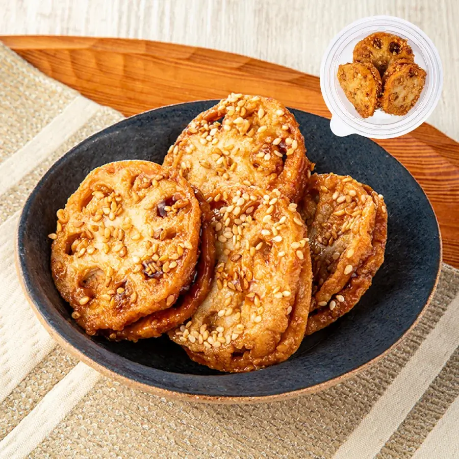 れんこんの食感を損なわない加工と調理が施されており、食べごたえのある一品として設定されています。素材の産地表記が明確な商品です。