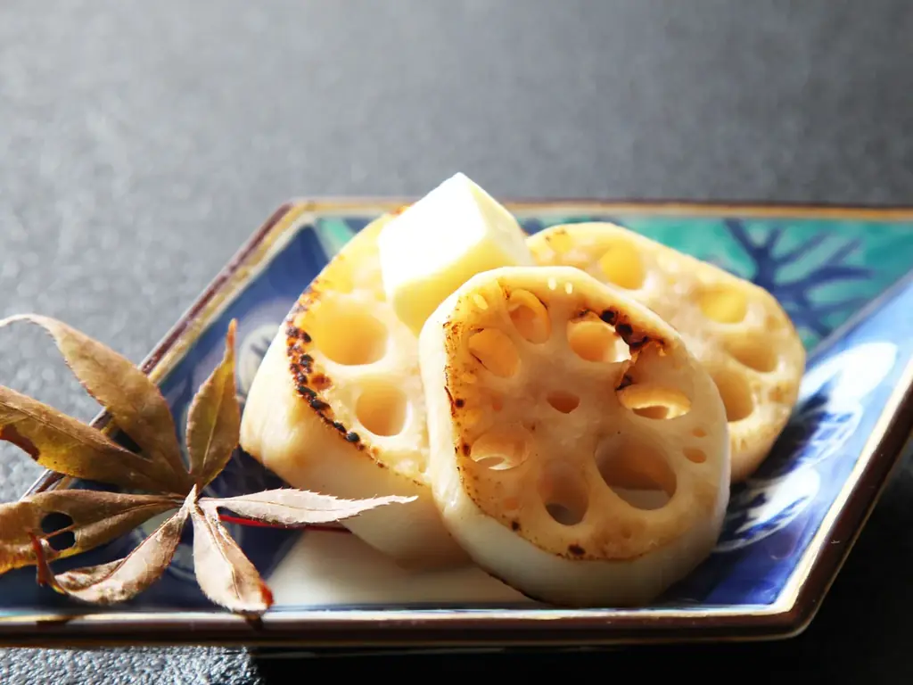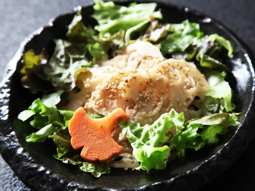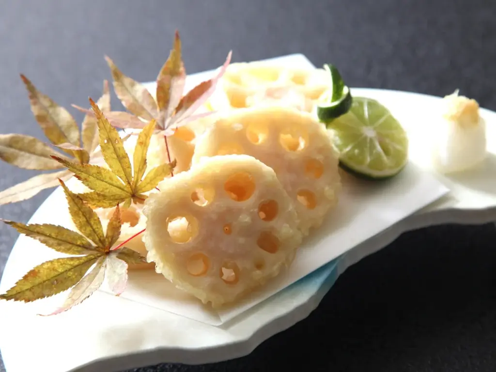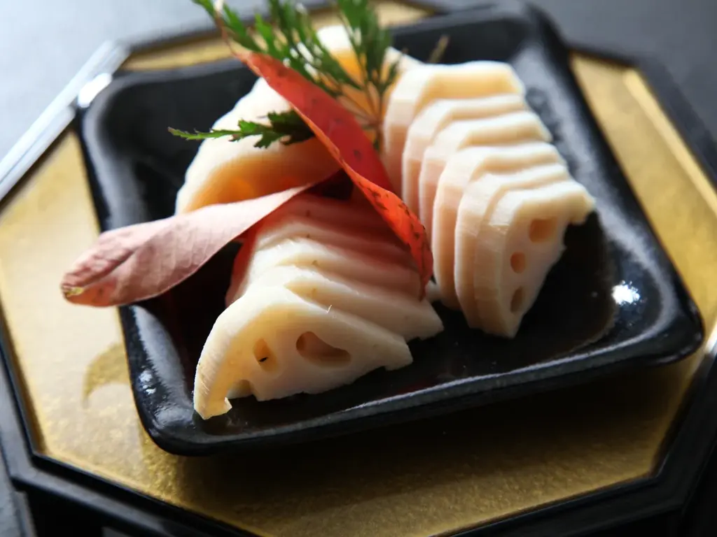 鳴門では会席料理内やオプションでれんこん料理が提供されます。郷土の海鮮に合わせてれんこんを使った繊細な一品が並びます。