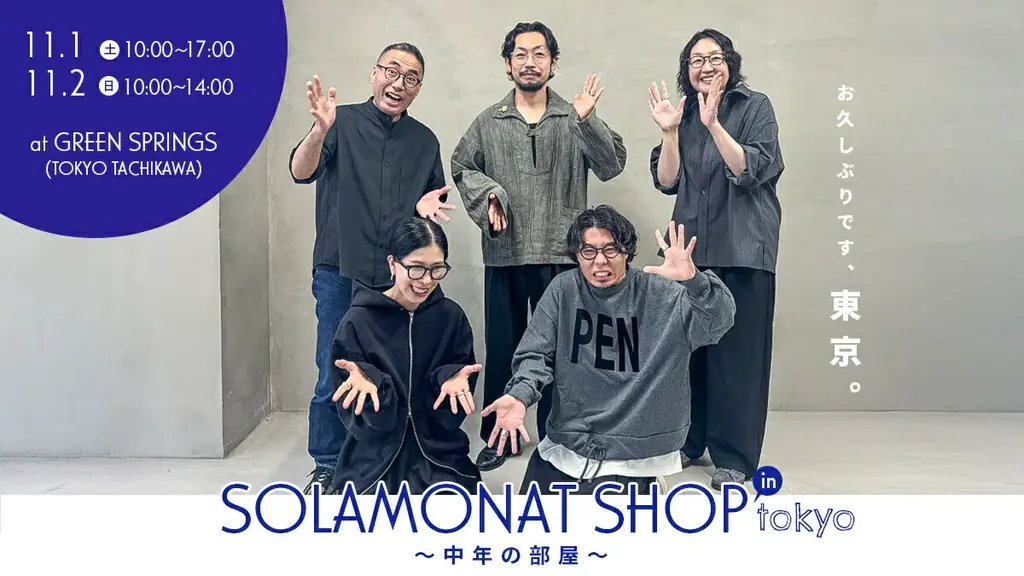 ポップアップの名称は「中年の部屋 × 東京ポップアップ 2025」。会期は2025年11月1日(土)~11月2日(日)、会場は東京・立川のGREEN SPRINGSです。入場は無料で、来場者は映像で馴染みの「中年の部屋」の出演者をリアルに感じつつ、商品を手に取ることができます。