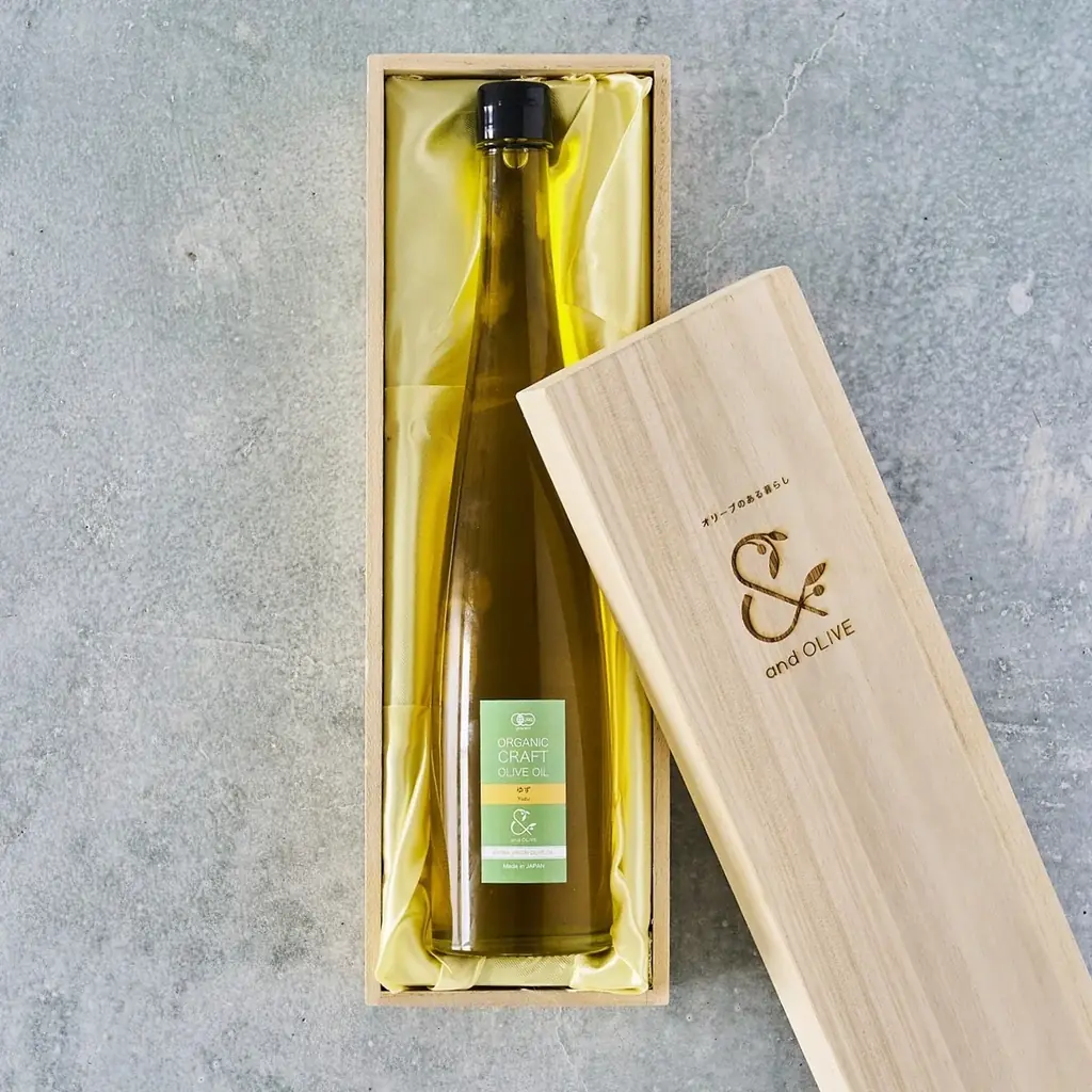 本製品は、LIOOC 2025のインフューズドオリーブオイル部門で銀賞を受賞した製品と同じ製法で生産したものです。原料は群馬県館林市産の有機オリーブと栃木県市貝町産の柚子で、搾油はコールドプレスにより行われます。限定品はシリアルナンバー入りの桐箱に収納されます。