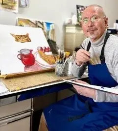 田中保範氏は1949年生まれ。料理と接客の現場で長年にわたり研鑽を積み、後にアーティストとしての制作活動に取り組むという経歴を持ちます。職務と美意識の双方で培った経験が、現在の絵画表現に直結しています。