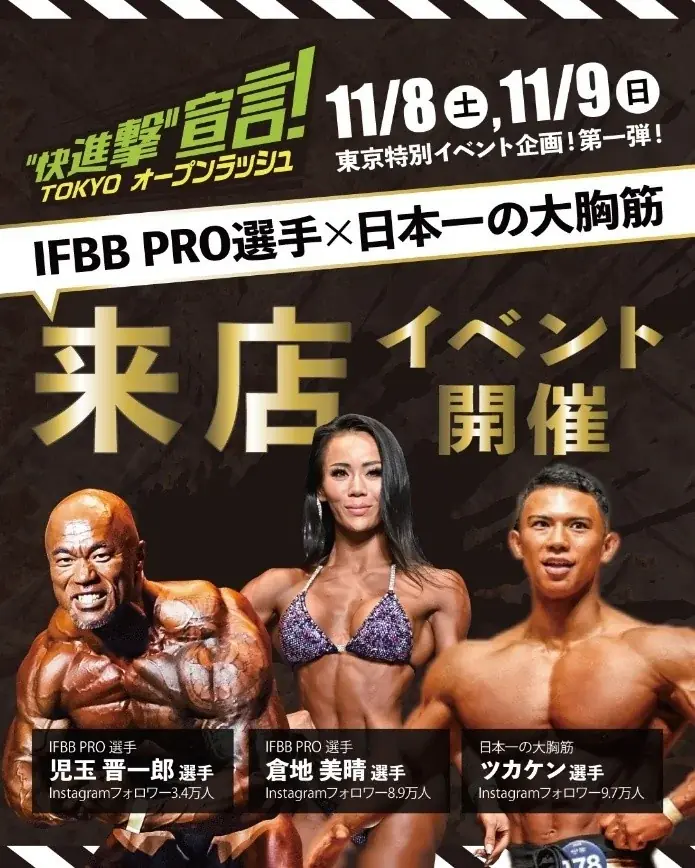 キャンペーン期間中には特別イベントも開催されます。第1弾として、IFBB PROアスリートの児玉晋一郎選手、倉地美晴選手、そして「日本一の大胸筋」ツカケン選手が来店し、トレーニングレクチャーやトークショー、写真撮影会、サイン抽選会を行います。