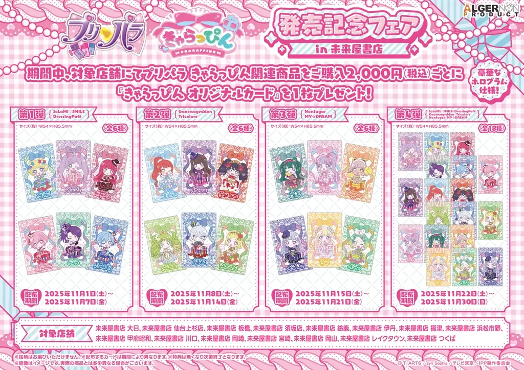 特典:期間中、対象商品を税込2,000円ご購入ごとに未来屋書店限定の「きゃらっぴんオリジナルカード(ホログラム仕様)」を1枚プレゼント。