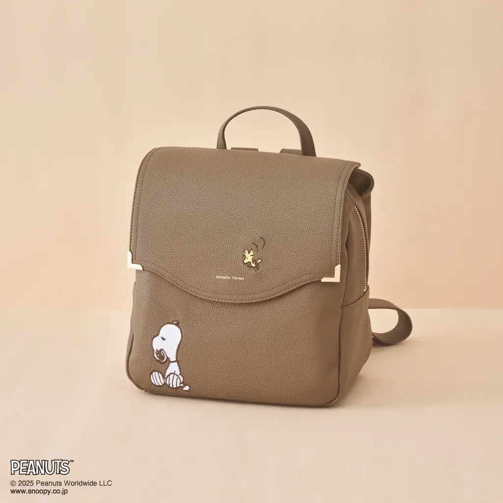 「ピーナッツ」の優しい世界観をイメージし、コーディネートに馴染みやすい落ち着いたグレージュカラーが採用されたリュックです。刺繍で描かれた「ウッドストック」と見つめ合う「スヌーピー」のモチーフが特徴で、両サイドに配されたゴールド金具が上品さを添えています。