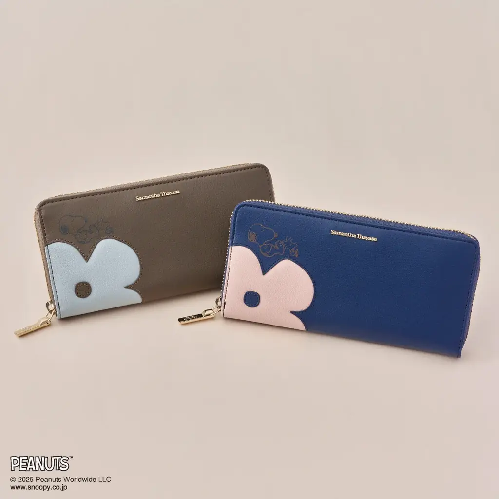 フラワーガーデンでリラックスしているような「スヌーピー」と「ウッドストック」を描いた財布。お花モチーフはボディとは異なる色でぷっくりと立体的に施され、上品で華やかな印象を与えます。配色はグレージュ×ライトブルー、ネイビー×ピンクの2種です。