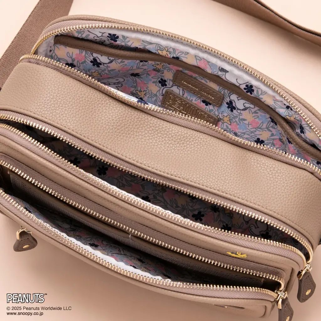 「ジョー・クール」がリラックスしている様子とサングラスをかけた「ウッドストック」がデザインされたショルダーバッグです。配色はグレージュ×ブラウン、ネイビー×ピンクの2種で、スタイリングのワンポイントになる工夫がされています。