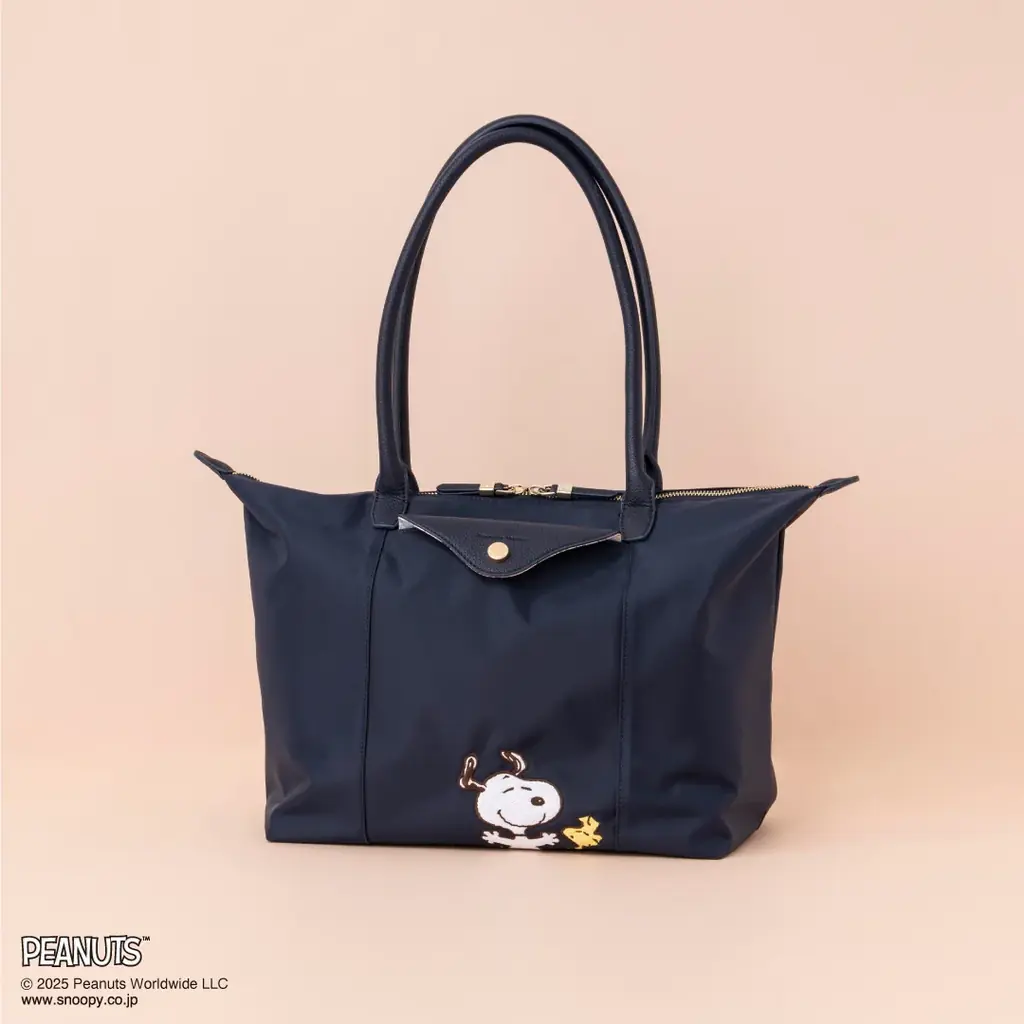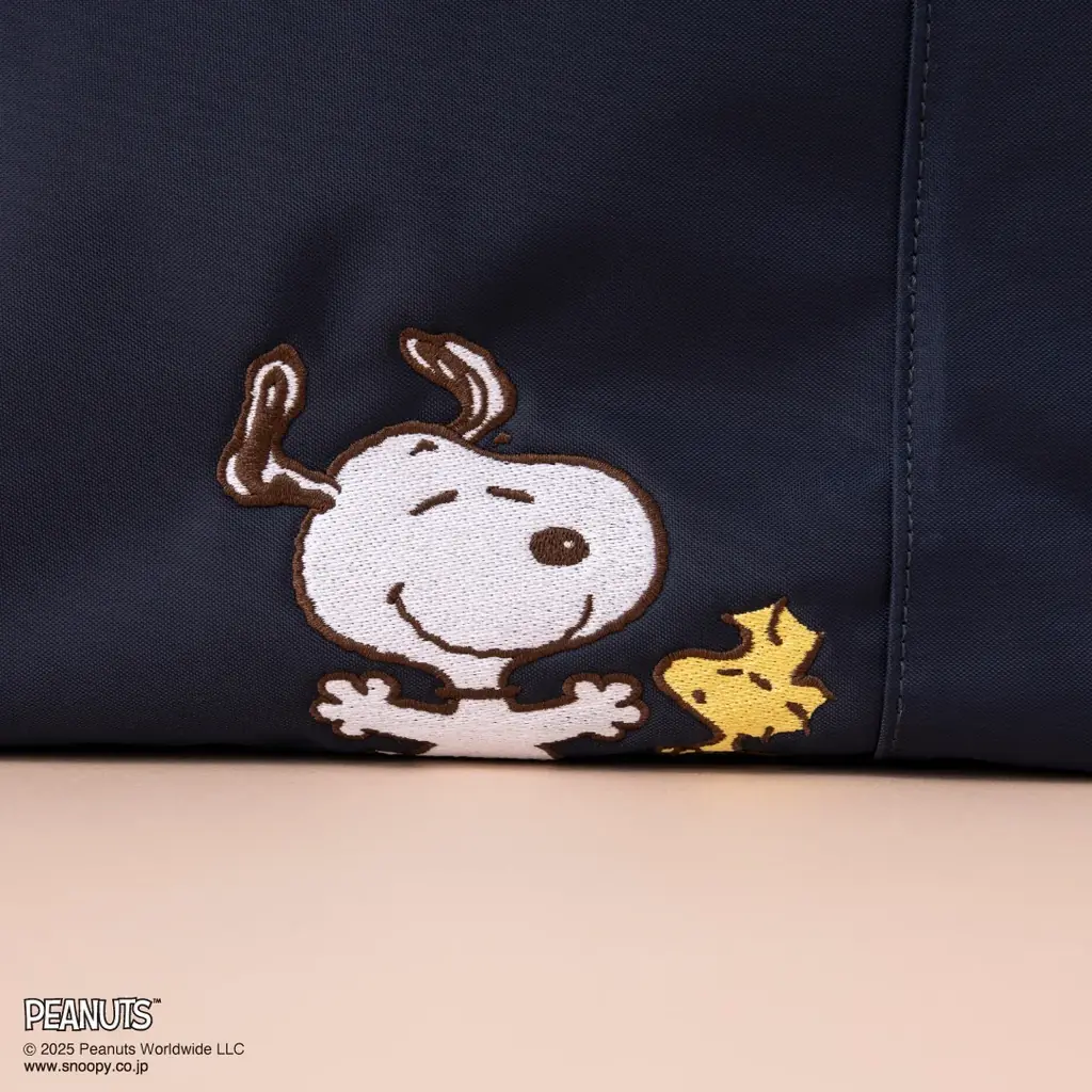 軽量で柔らかいナイロン素材を採用した大容量トートバッグ。正面には、両手を上げて楽しそうな「スヌーピー」と、そのそばに寄り添う「ウッドストック」の刺繍デザインが配置されています。薄マチのポケットが正面にあり、スマートフォンなどの収納に適した作りです。