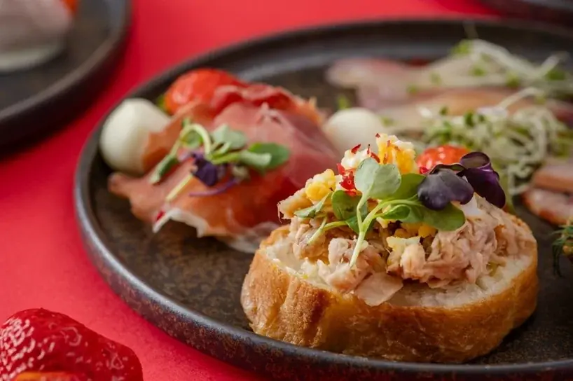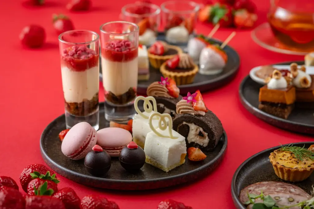 おすすめスイーツとしては、いちごのマカロンやいちごのショートケーキなどの王道に加え、パティシエの工夫が光るベリーティラミスやストロベリーカバーリングチョコレートがラインナップされる。セイボリーは豊洲直送素材を活かした自家製ツナのクロスティーヌなどが用意される。