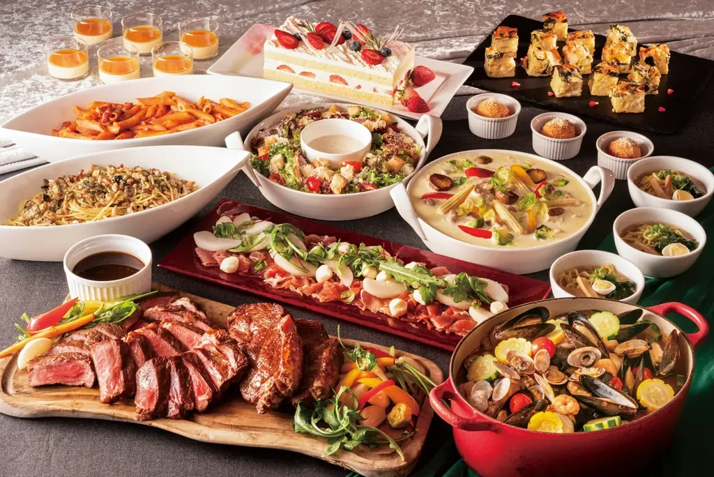 メニューは冬の味覚を中心に多彩に揃えられており、メインの肉料理や魚介料理のほか、寒い季節に嬉しい温製料理、彩りのある冷製オードブル、子ども向けメニュー、ホリデースイーツが並びます。ソフトドリンクバーは無料で利用できます。