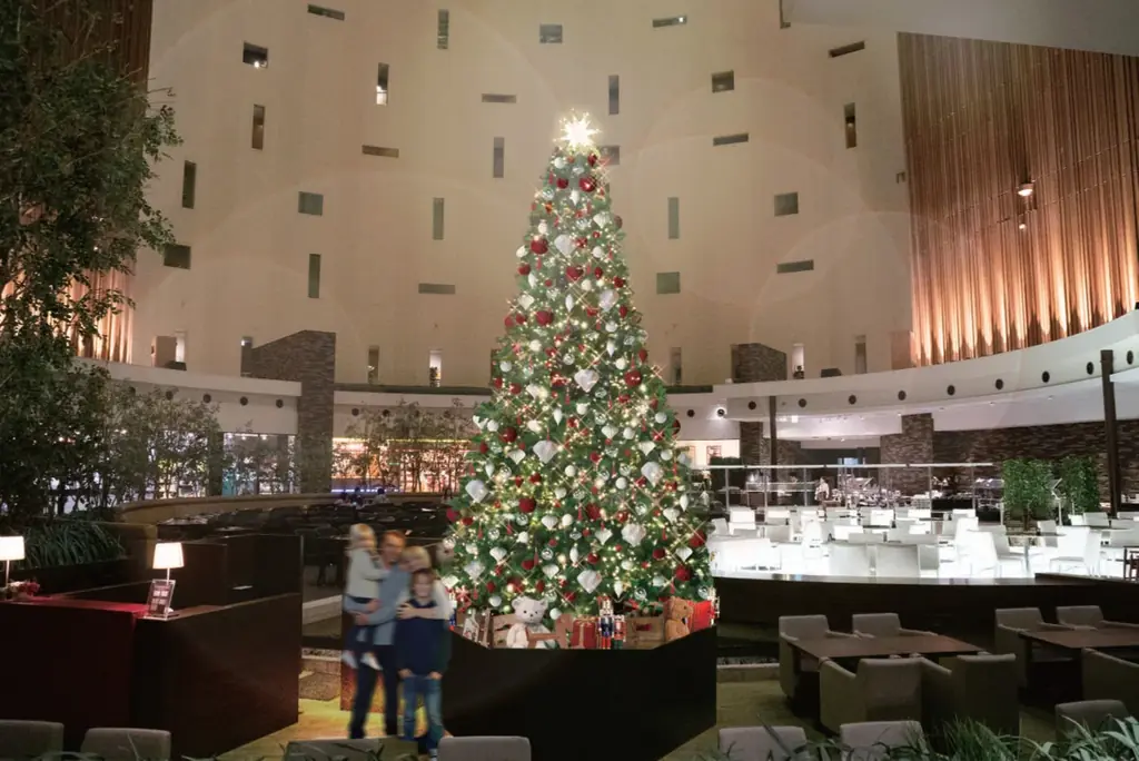 アトリウムでは2025年11月11日(火)から12月25日(木)まで、赤と白を基調としたクラシックなクリスマスツリーが飾られます。ツリーの高さは約6メートルで、足元にはプレゼントボックス、テディベア、くるみ割り人形が配置され、絵本のような光景が展開されます。