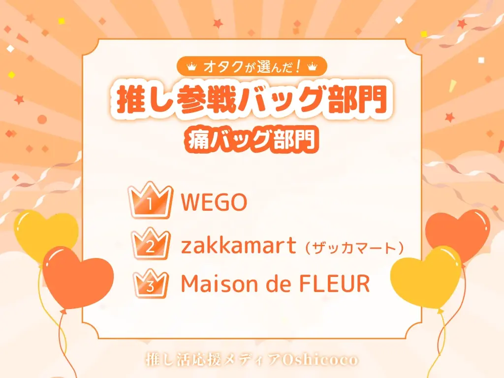 痛バッグ部門では「WEGO」が1位で、低価格と機能性が評価されました。2位は「ザッカマート」、3位は「Maison de FLEUR」で、後者は表面を通常のバッグとして使いつつ裏面がクリアという特徴が愛用理由として挙げられています。