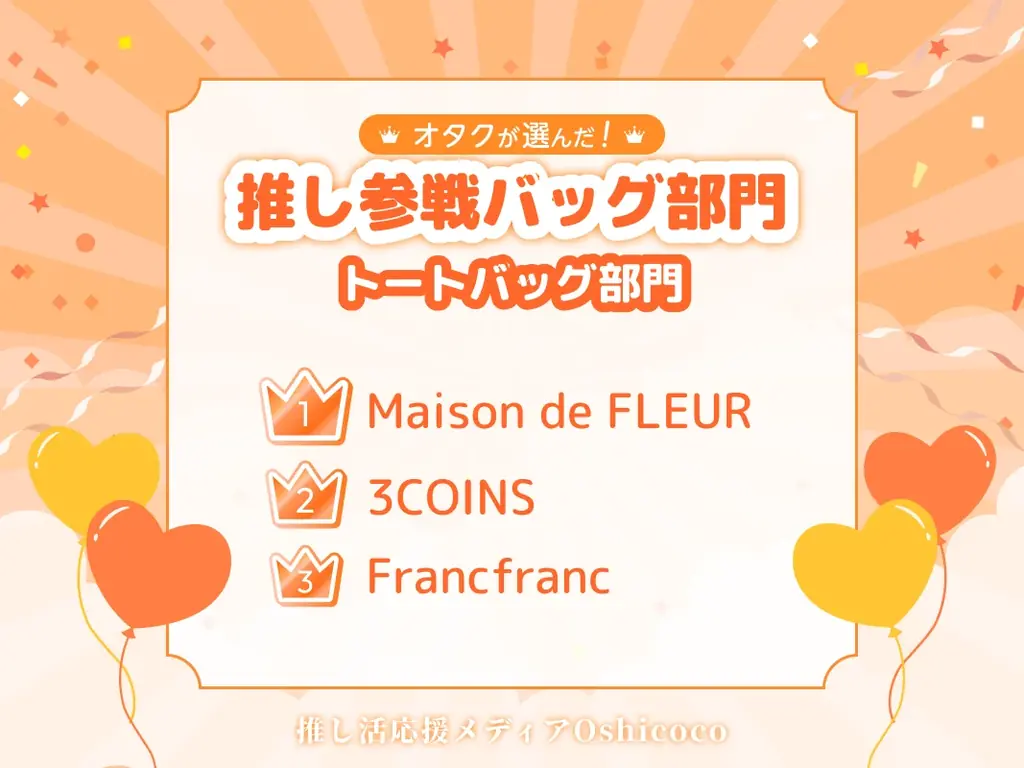 ハンドバッグ部門は1位「JILL by JILL STUART」、2位「RANDA」、3位「epine」。トートバッグ部門は1位「Maison de FLEUR」、2位「3COINS」、3位「Francfranc」となり、うちわやペンライトなどかさばるグッズを収納しやすい点が支持されています。