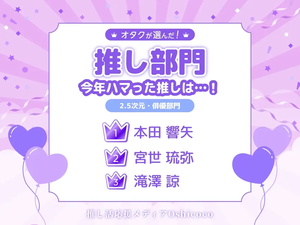 2.5次元・俳優部門は1位が本田響矢、2位が宮世琉弥、3位が滝澤諒でした。舞台での存在感や演技、キャラクター性が評価されています。