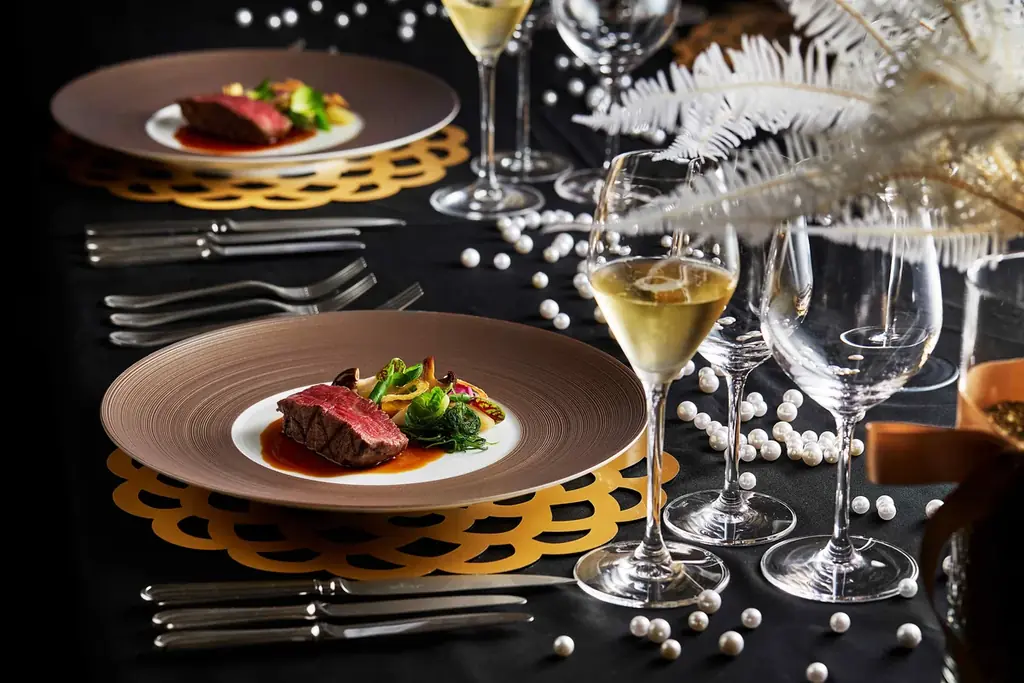 大晦日の夜を彩るガラディナーは、煌びやかな装飾とシャンパンツリーが輝く空間で始まるカクテルレセプションからスタートし、続いてシェフによる華やかなコースディナーが提供されます。幻想的な装飾と音楽のもと、2025年の締めくくりと新年2026年の訪れを祝う構成です。