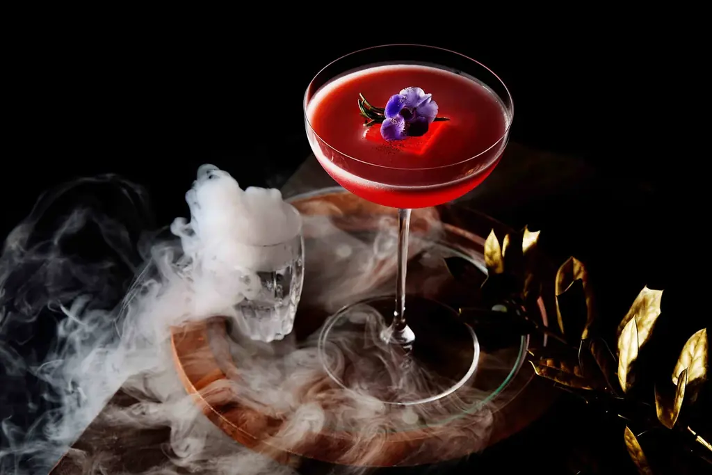 ザ・バーでは、クリスマスの雰囲気を表現した期間限定カクテルを提供します。特製カクテルは、いちごの酸味とヘーゼルナッツの芳醇な香りを組み合わせ、白いミストと雪のような演出で幻想的な見た目を演出します。
