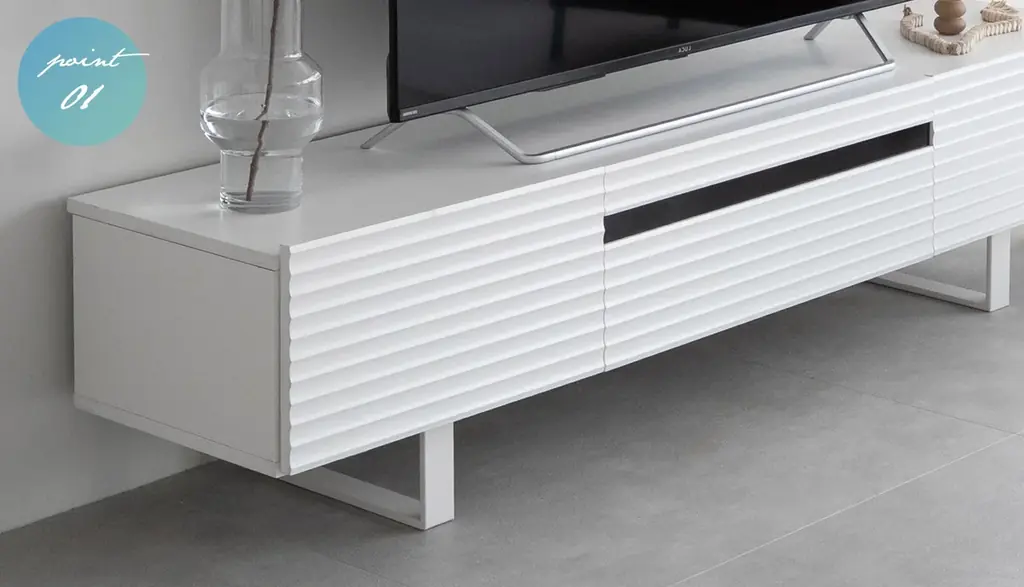 白基調の横リブ(波目)加工が光と陰影を作り出す幅180cmのワイドTVボード。スチール脚で抜け感を出し、マグネット式フラップ扉と可動棚で見せない収納を実現します。