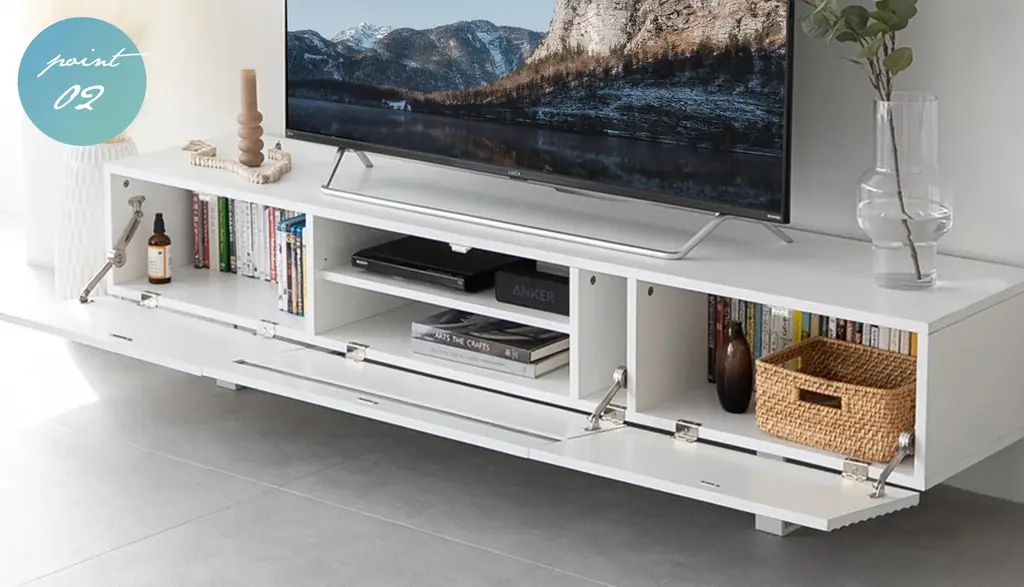 striaは外観の美しさだけでなく、実際の生活で使いやすい収納機能を備えています。左右の収納はフラップ扉(手前に開くタイプ)を採用しており、リビングの機器や小物を見せずに収納できます。