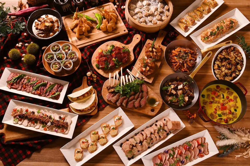 ディナーにおける食べ放題へのアップグレードは+2,800円で可能と案内されています。カニ以外にも、カニの旨みを引き立てる各種肉料理、季節の野菜、彩り豊かなデザートがバイキングメニューに揃い、冬の味覚を組み合わせて楽しめます。