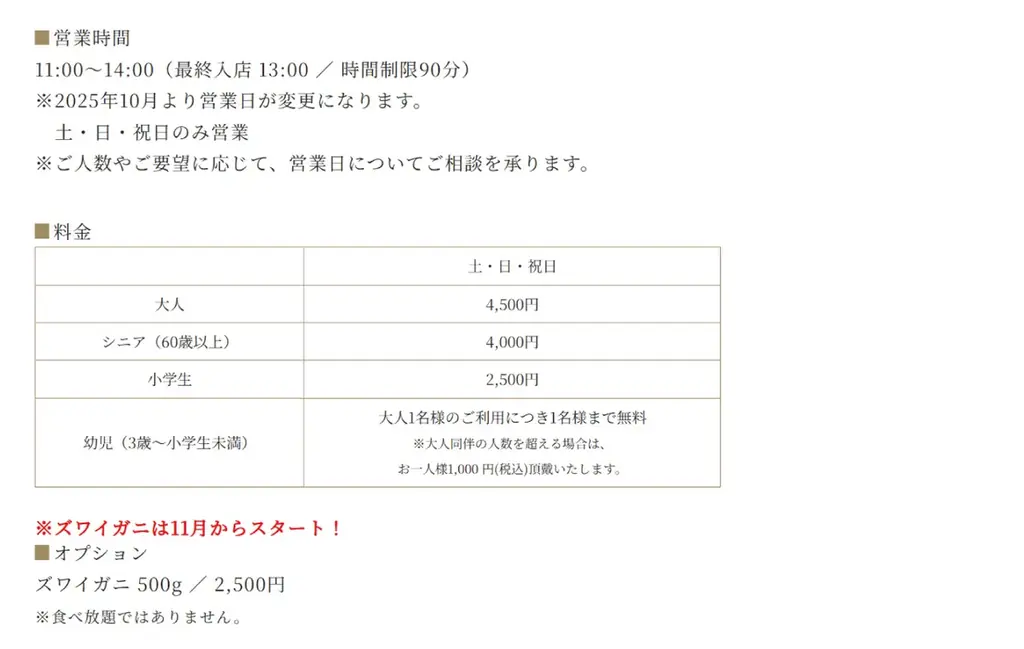 | お客様感謝企画 | 期間:2025/10/01~2025/11/30。公式サイト予約限定で大人4名につき1名無料。対象は大人・シニア(ランチ・ディナー)。ズワイガニ食べ放題、ドリンク、追加オーダー、小学生以下は対象外。他特典併用不可。 |
