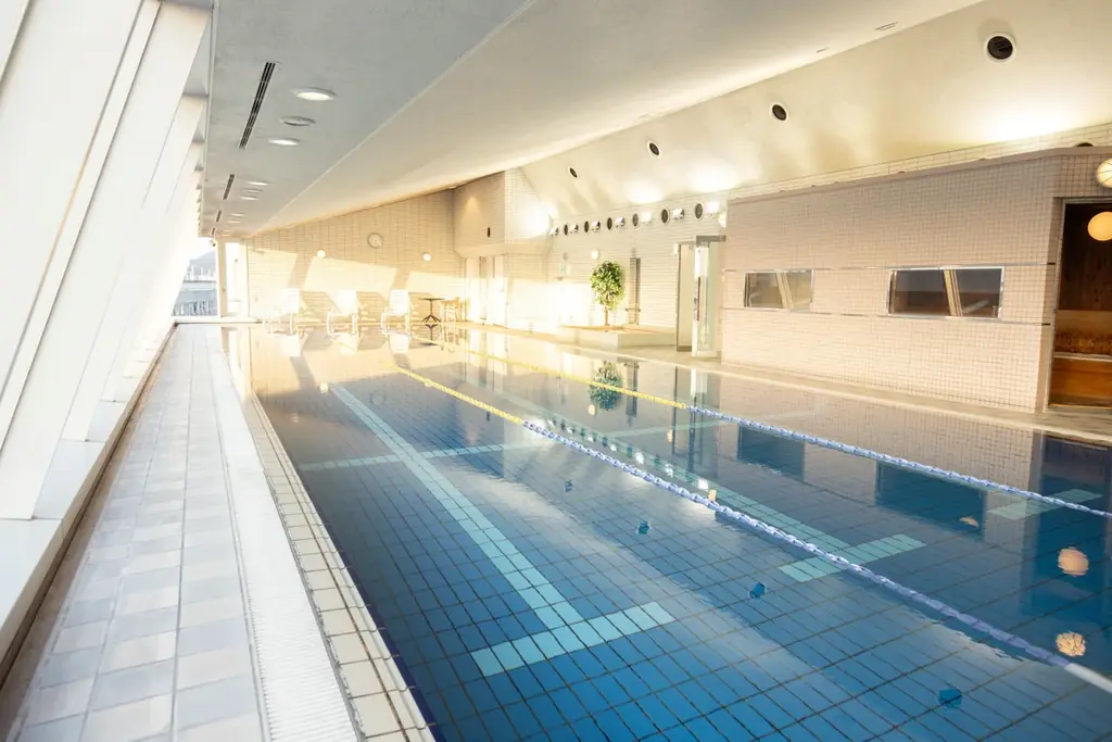 リゾートクラブでは自然光が差し込む温水プール、ジャグジー、サウナを利用できます。水着やゴーグルの無料貸出があり、手ぶらで立ち寄ることが想定されています。営業時間は6:30~22:00(最終受付21:00)です。
