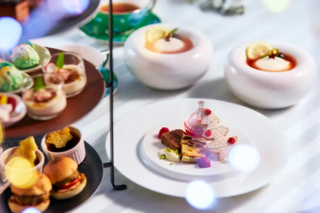 セイボリー(軽食)にはフォアグラブリュレやトリュフリゾットのクロケット、蕪のムースと蟹のコンソメ添えなど、贅沢で味わい深い料理が用意されます。ドリンクは紅茶やコーヒーに加え、加賀棒茶やジャスミン茶など和洋中のティーセレクションが揃います。