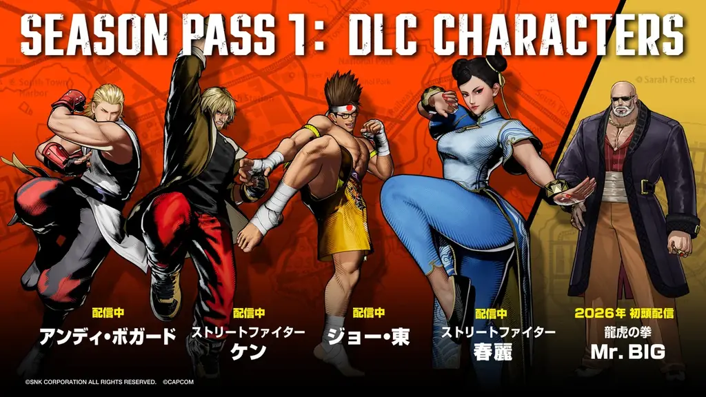 シーズンパス1に含まれるDLCのうち、「アンディ・ボガード」「ケン」「ジョー・東」「春麗」は配信中と明記されています。一方で「Mr.BIG」は2026年初頭に配信予定とされています。これにより今後も追加キャラクターを含む展開が継続される予定です。