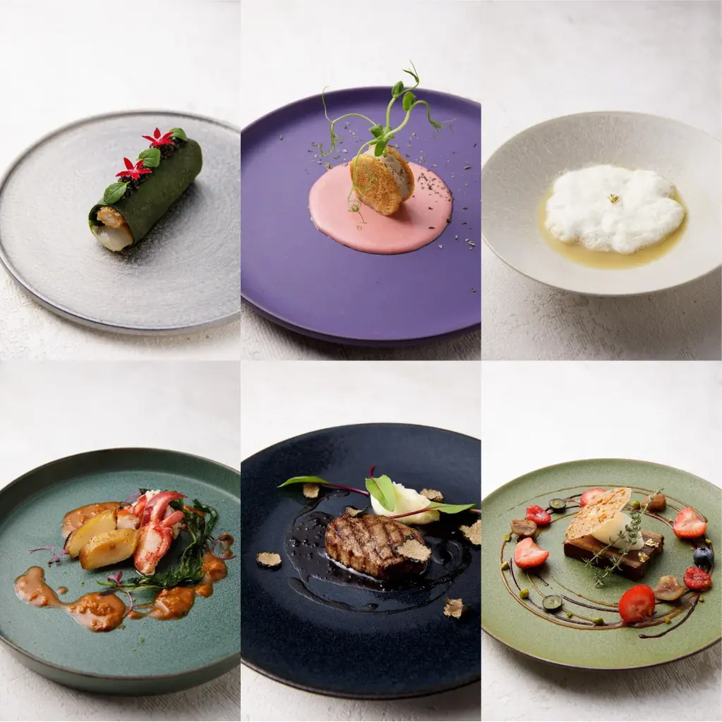 クリスマス期間中のメインイベントの一つとして、シェフの独創性と九州産食材の融合を目指したクリスマスディナーコースを用意しています。料理は見た目、香り、味わいのバランスを重視して構成され、前菜からデセールまで順に五感で楽しめるラインナップです。