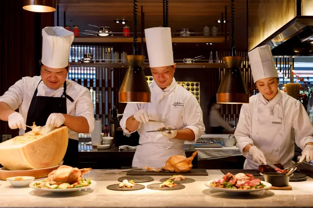 クリスマス目前の週末に実施されるディナービュッフェは、2日間限定でライブキッチンを中心としたメニュー構成です。シェフズステーションでは切りたてのローストやグリル料理を提供し、デザートコーナーではシェフが目の前で仕上げる熊本県産和栗のモンブランなどが並びます。