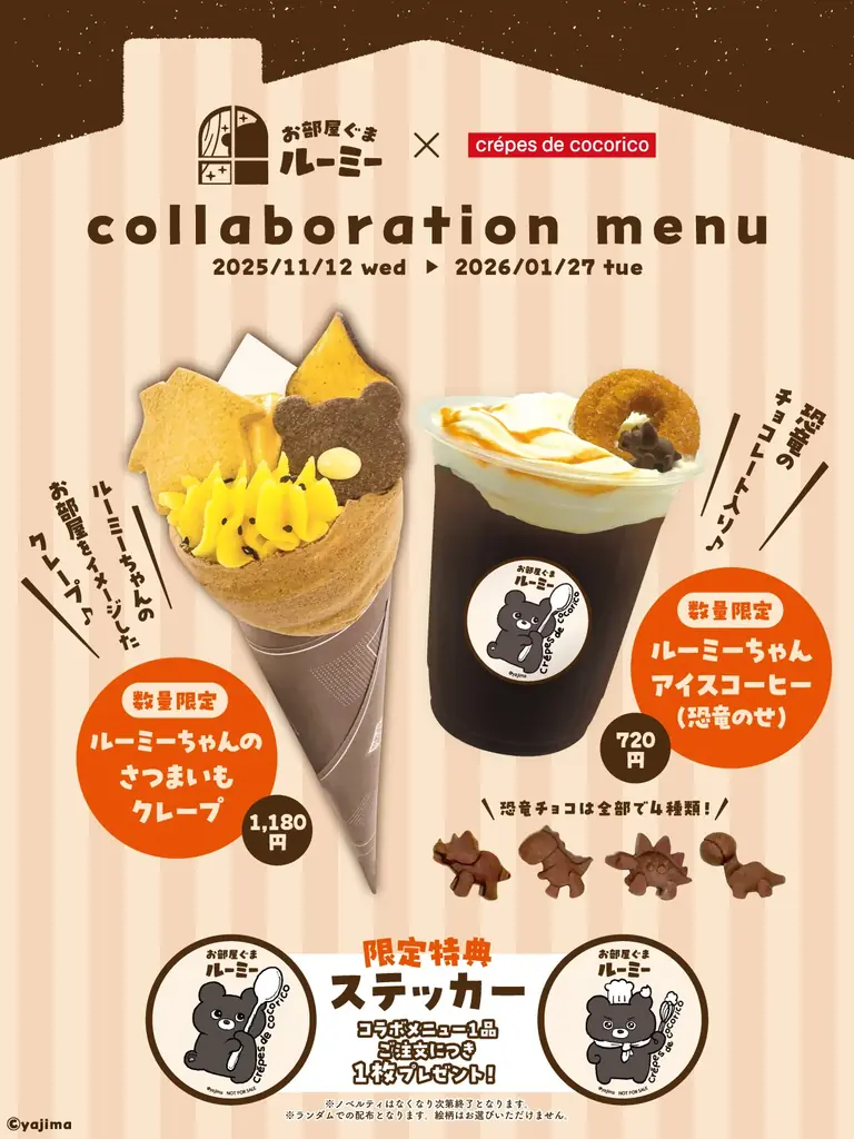 「クレープ・ド・ココリコ」(大阪梅田)とお部屋ぐまルーミーのコラボレーションが決定し、期間限定でコラボクレープとドリンクが販売されます。今回のコラボでは新規描きおろしの限定ノベルティが付属するメニューが提供されます。