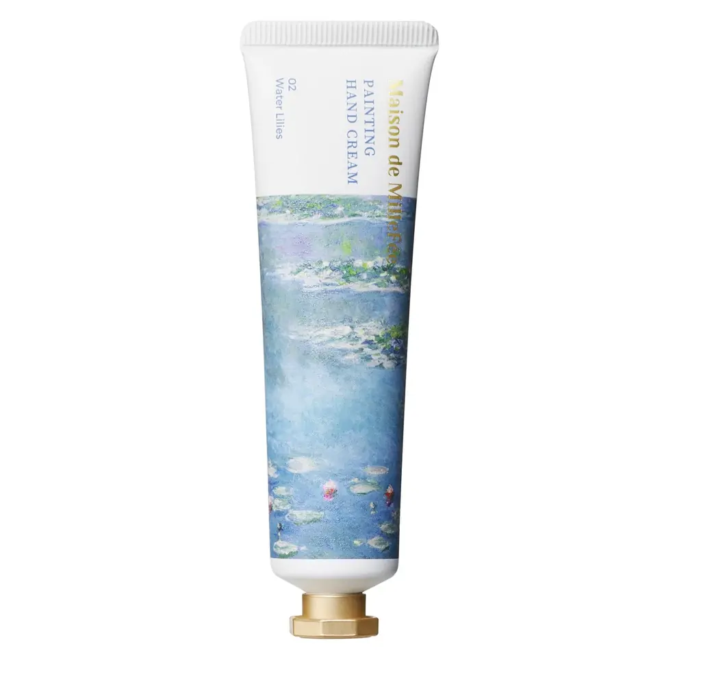 - メゾンドミルフィー 絵画ハンドクリーム 睡蓮(ライフスタイルカンパニー):1,320円(新商品)。世界の名画から着想を得た香り設計で、ジュニパーベリーとレモンのトップノートからバニラやサンダルウッドの甘さへ移る構成。