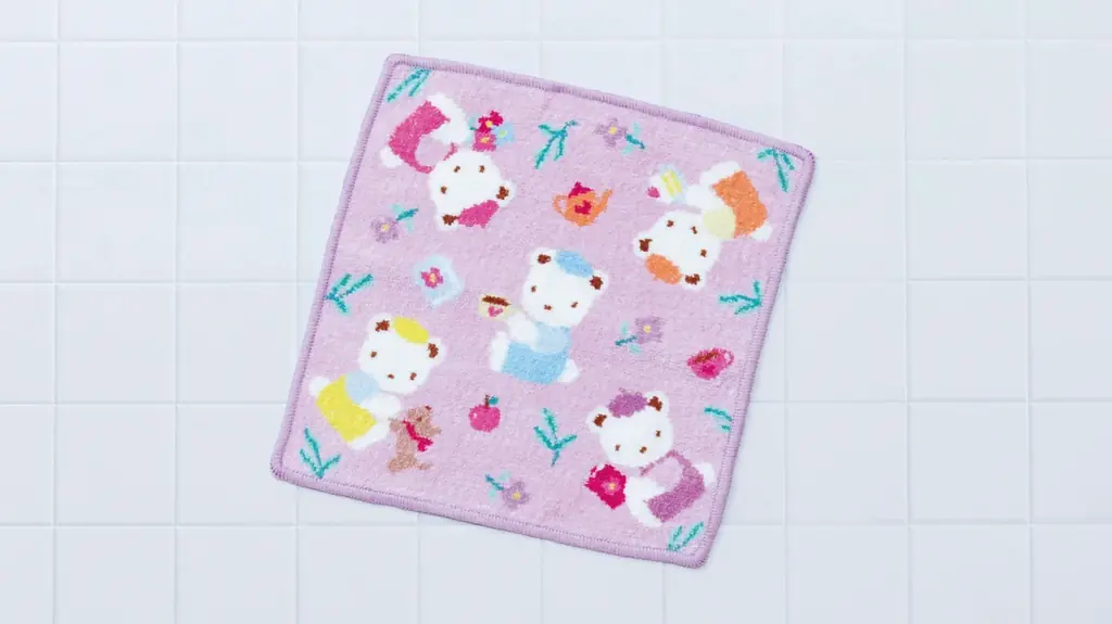 タオルハンカチはシェニール織を用いた品で、本体色は優しいパープルを基調としている。アートにはカラフルな洋服を着たクマちゃんたちがケーキを食べたり、犬と遊んだりする姿が描かれており、リラックスしたおうち時間の情景が表現されている。