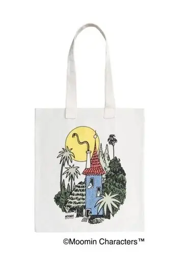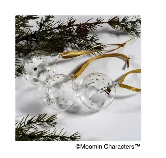 ムーミンショップではクリスマス向けのインテリア雑貨やエコバッグが並ぶ。例としてMuurlaのクリスマスボール Sparkling stars 3個セットは6,050円、リサイクル綿100%のエコバッグ ムーミンハウスは3,080円である。