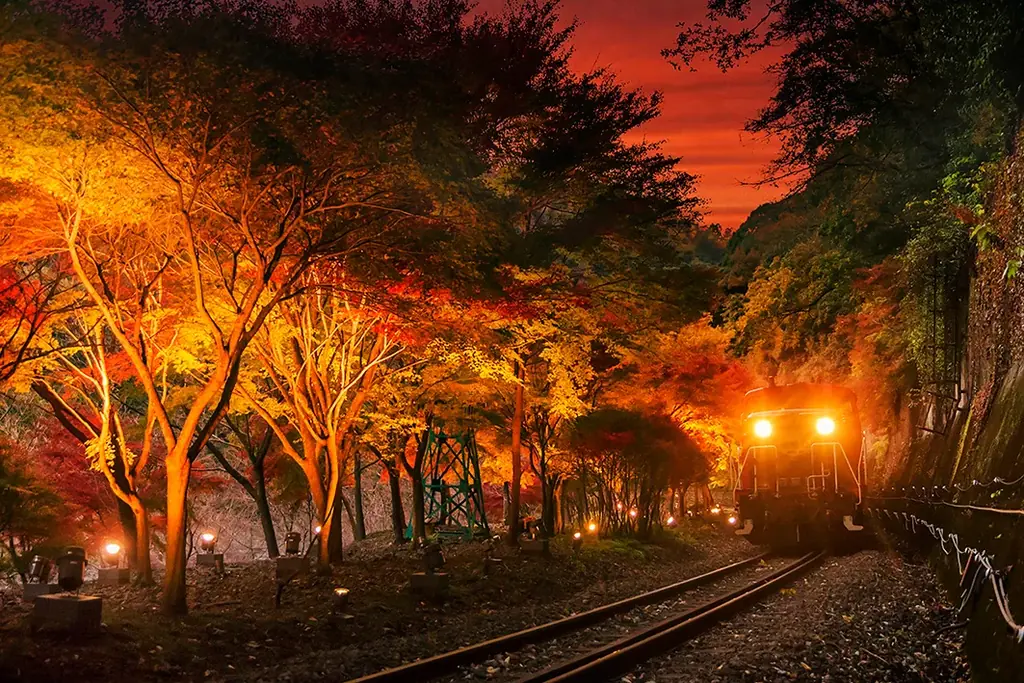 光に包まれた車窓の風景は、従来の観光列車とは趣を異にします。ライトアップされた山肌や川面の反射が列車内を幻想的に照らし、移動そのものが物語の一場面として演出されます。期間限定、夜間運行という点からも“この日だけの特別体験”として設計されています。