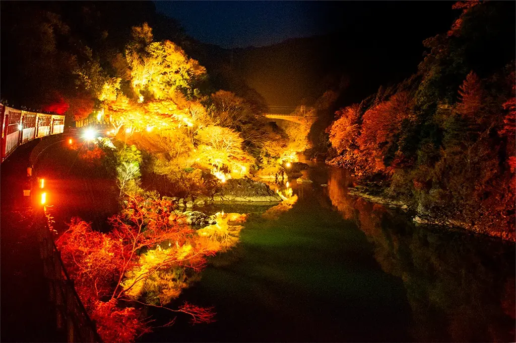 - 保津川渓谷沿いの山々・川面を彩るイルミネーション