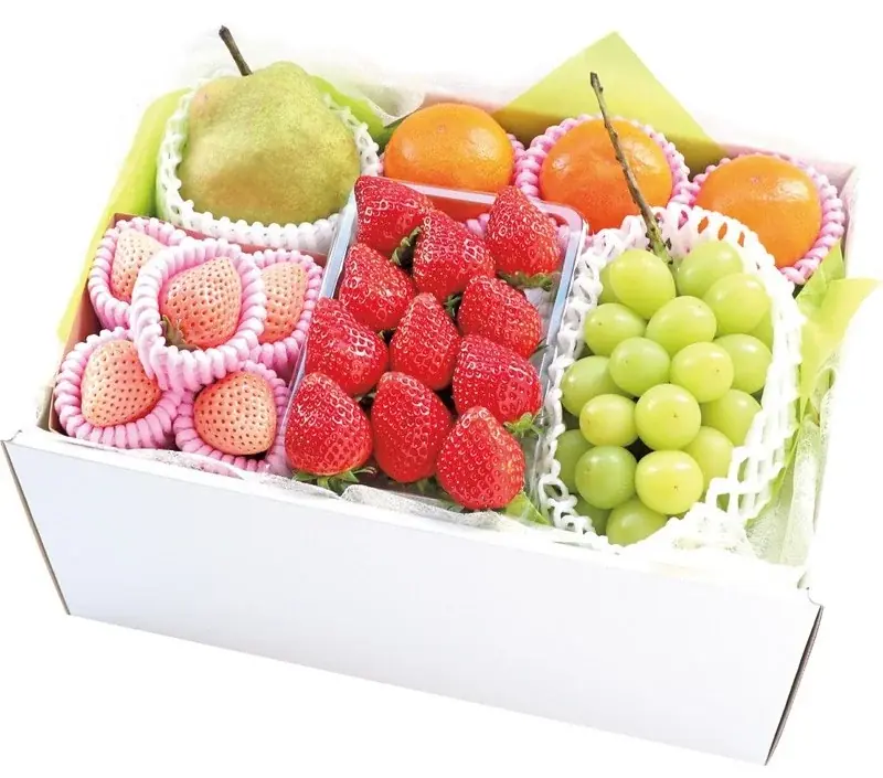 - 内容:赤いちご1パック、白いちご4〜5粒、シャインマスカット、西洋梨、みかん3個