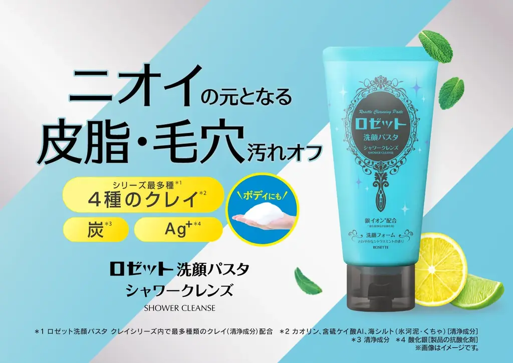 | ロゼット洗顔パスタ シャワークレンズ | ニオイの元となる汚れに着目。皮脂や毛穴汚れを除去し、テカリのないサラサラの肌へ導く | 120g | 660円/726円(税込) | 銀イオン(酸化銀)[製品の抗酸化剤]、4種のクレイ(カオリン、含硫ケイ酸Al、海シルト(氷河泥・くちゃ))[清浄成分]、炭[清浄成分] |