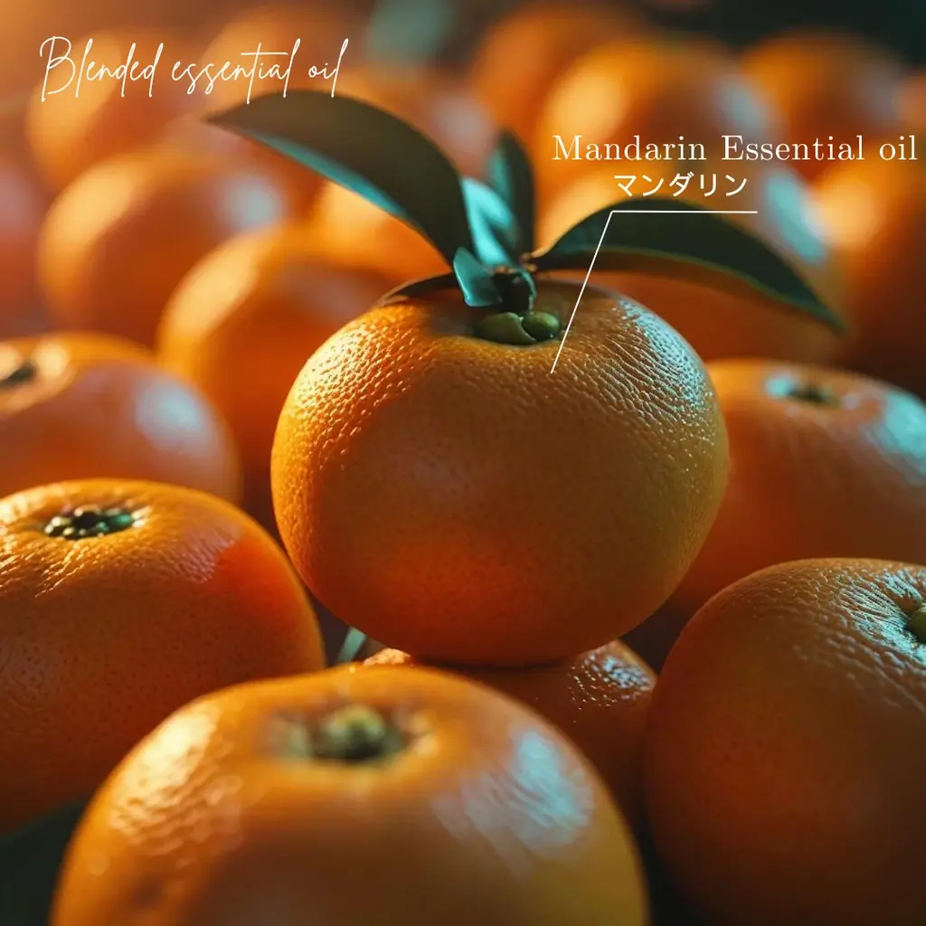 コラボレーションで採用された香りは“マンダリン”です。マンダリンは柑橘類の中でもフルーティーな甘さが特徴で、まろやかな甘みと酸味が広がる香りとして親しまれています。精油はマンダリン果皮から抽出され、リラクゼーション効果が期待されるため、気分転換やくつろぎの時間に適しています。