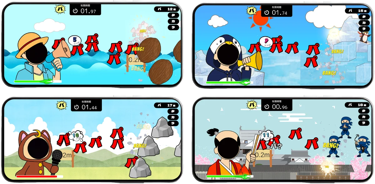 - 「パ」「タ」「カ」「ラ」の発声が音声認識され、対応するアクションで敵を倒す新感覚のゲーム形式。