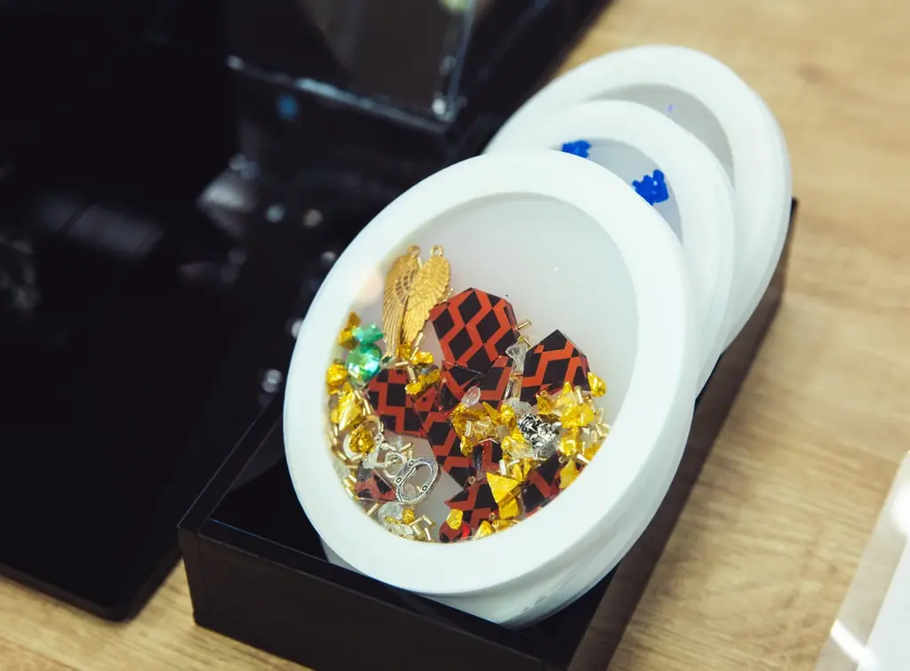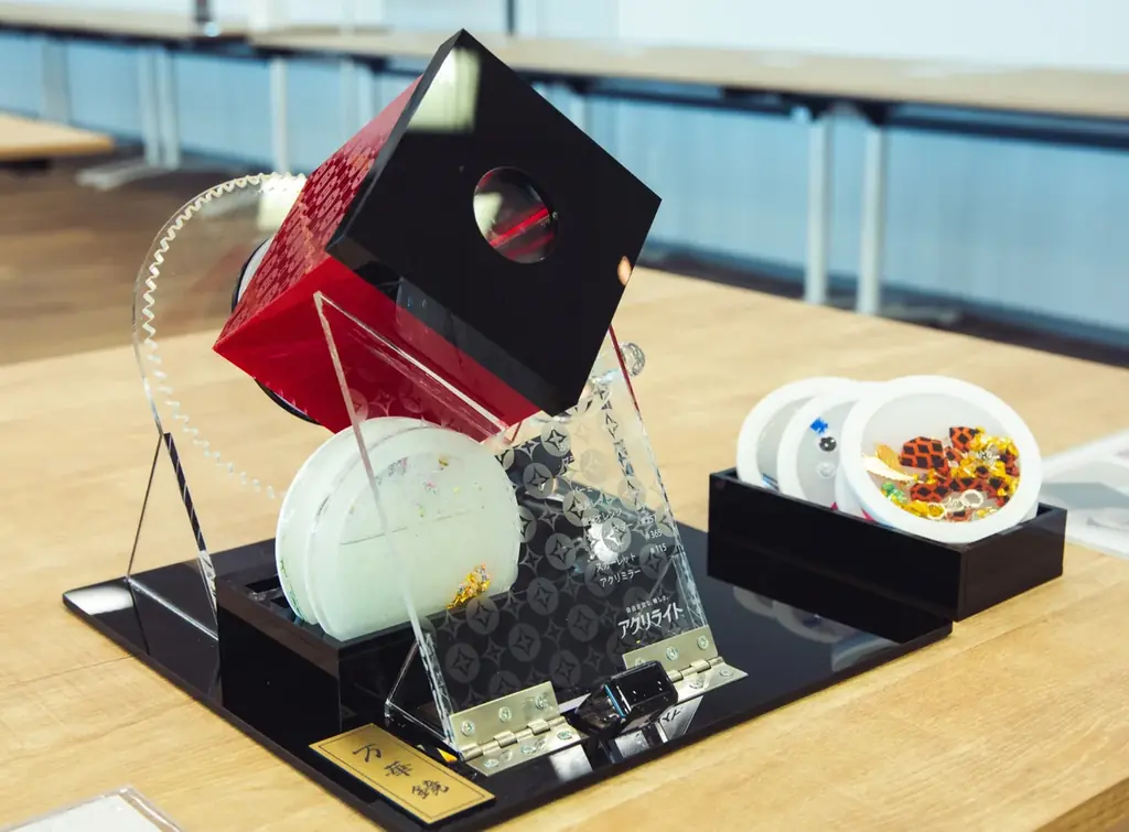 和柄が施されたキューブ状の万華鏡に色鮮やかなカセットを差し込む仕様で、光の世界をテーマに改良の過程を体感できる作品。カセットの差し替えによりアクリライト™の豊富なカラーバリエーションやカッティング表現を楽しめる設計になっている。