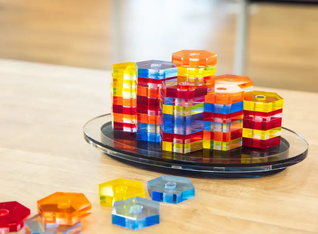 六角形の赤青オレンジ黄色のパーツが積み重なった様子を持つ、ひとりでも複数人でも楽しめる立体五目並べ。角を丁寧に削ぎ落とした研磨加工により、アクリライト™の高い加工性と触感を活かした遊具となっている。