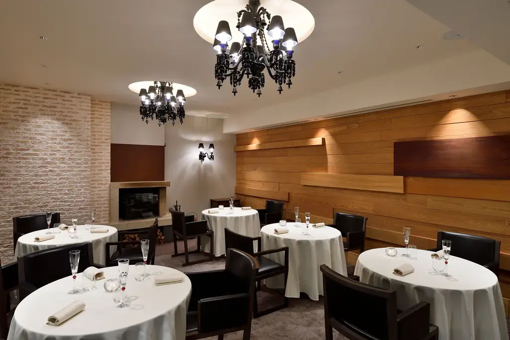 リニューアルにより接客動線と客席の快適性が見直され、食事のペースや会話のしやすさが確保されています。バカラとロブマイヤーという二種類のシャンデリアが、それぞれパブリックエリアと個室で異なる表情を演出します。