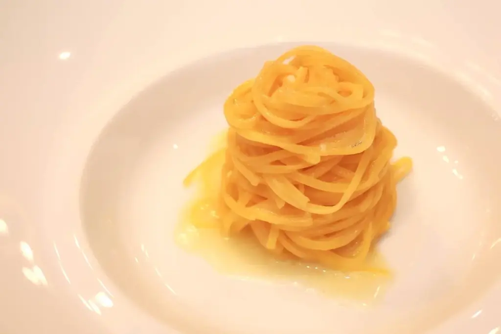 メインの後にはスペシャリテとして、ピエモンテ州の卵をたっぷり使った麺「タヤリン(tajarin)」を締めのパスタとして提供します。タヤリンは卵の風味とシンプルな仕立てで、メインの余韻を受け止める構成です。