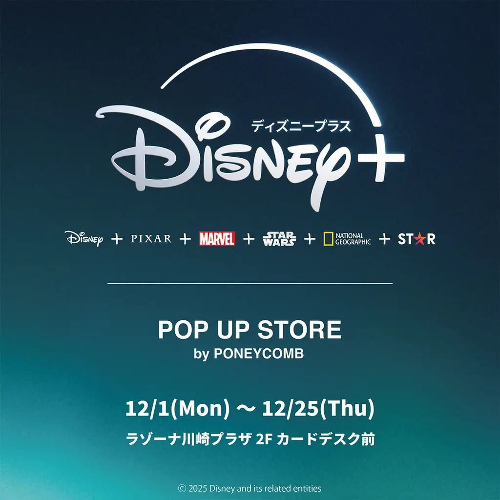- Disney+ POP UP STORE by PONEYCOMB:12/1(月)~12/25(木)。Disney SERIES CREATED by MUS POP UP STORE:12/1(月)~12/25(木)。