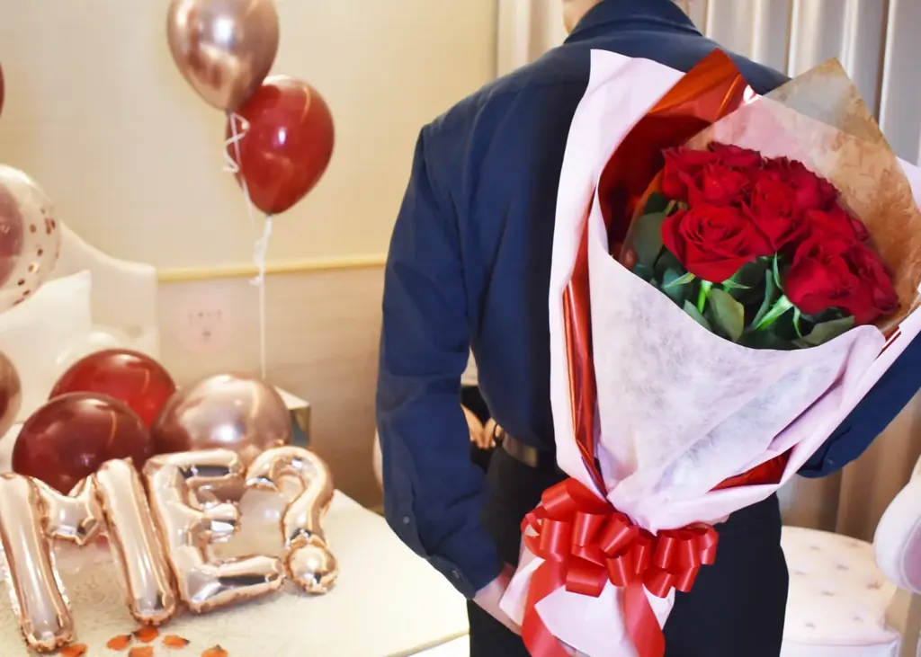 客室には当日の演出としてバルーンアートとダズンローズの花束が配置され、視覚的な華やかさを演出します。花束はチェックイン前に客室に設置されるため、到着と同時に演出が整っている状態です。