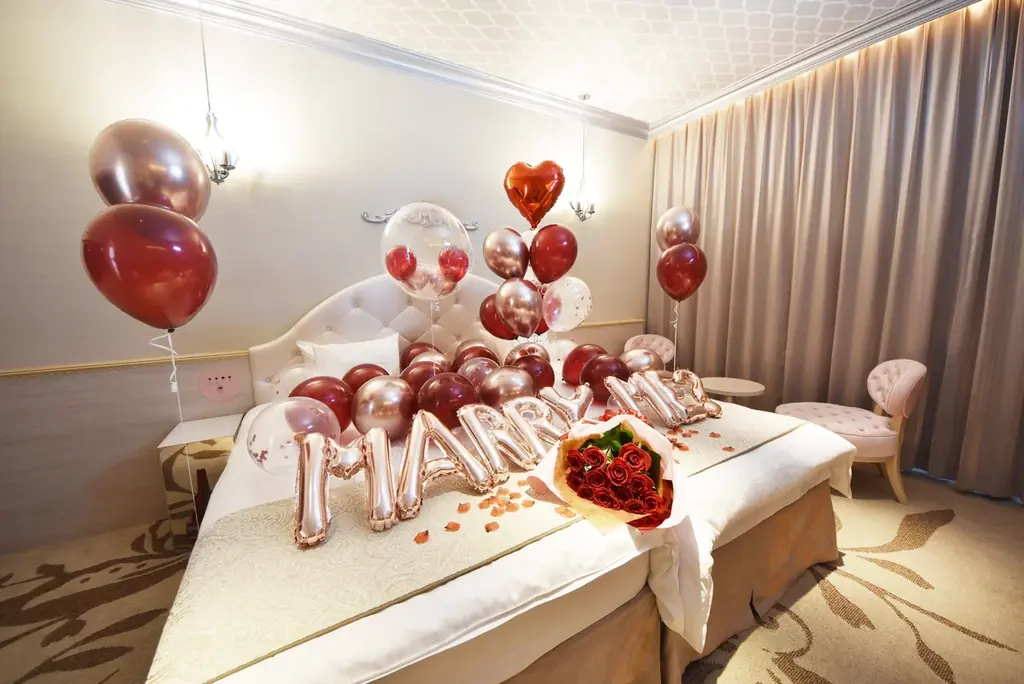 - 指定日に来館、チェックイン前に花束とバルーン装飾が客室に用意されている