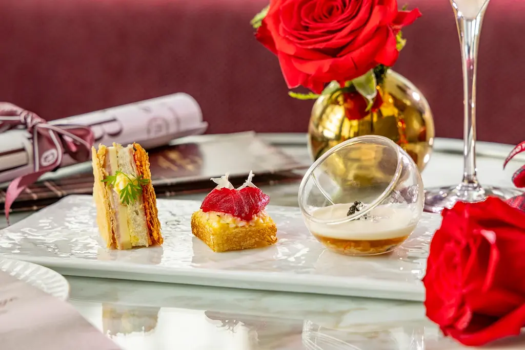 「フェスティブアフタヌーンティー」は、スイーツ5種、セイボリー3種、スコーン2種とドリンクセレクションで構成されます。ウェルカムドリンクには薔薇のエスプーマをトッピングしたカクテルが提供され、ナイトティーではスパークリングワインのフリーフロー付きプランも用意されています。