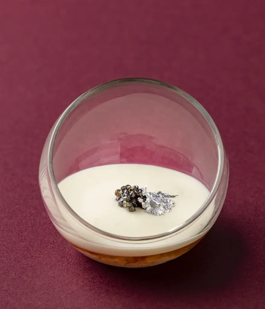 蟹のタルタルにビーフコンソメのゼリーと根セロリのクリームソースを重ね、キャビアと銀箔をトッピング。蟹とコンソメの豊かな風味に根セロリの爽やかなアクセントを加え、奥行きのあるセイボリーです。