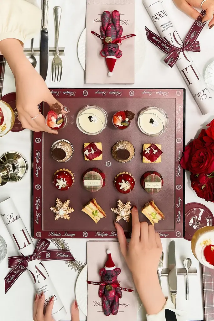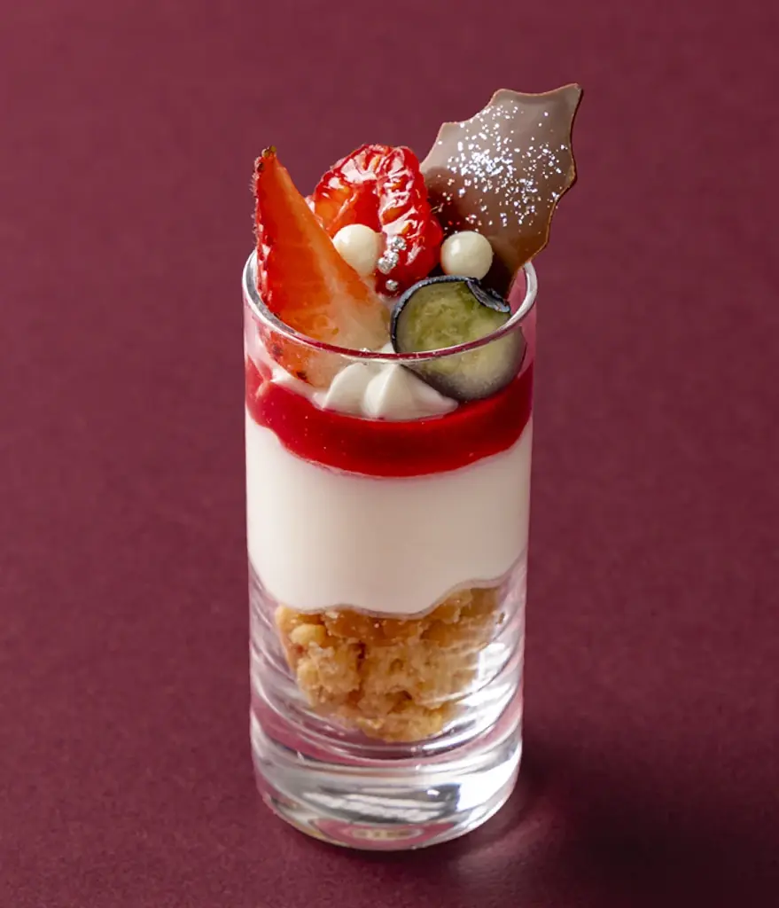 今回のアフタヌーンティーで提供されるスイーツは、オーナメントを模したデザインやタータンチェックのビジュアルを取り入れ、ホリデーらしい色合いと質感を重視して構成されています。素材にベリーやチョコレート、フランス産栗、ジンジャーなどを用い、味わいのコントラストと食感の変化を意識しています。