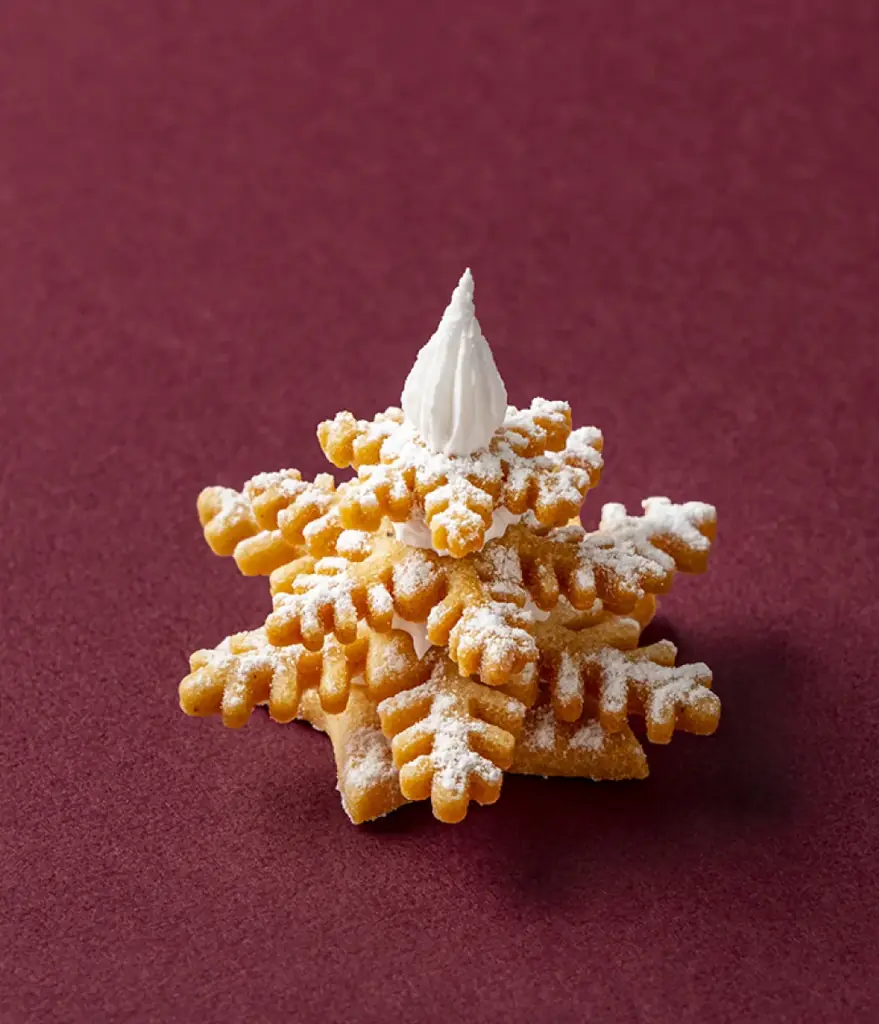 雪の結晶模様のジンジャーブレッドを積み上げてクリスマスツリーに見立てたクッキー。ジンジャーの風味を効かせた繊細な一品で、見た目と風味の両面でホリデー気分を演出します。 - ラズベリーとフロマージュブランのトライフル
