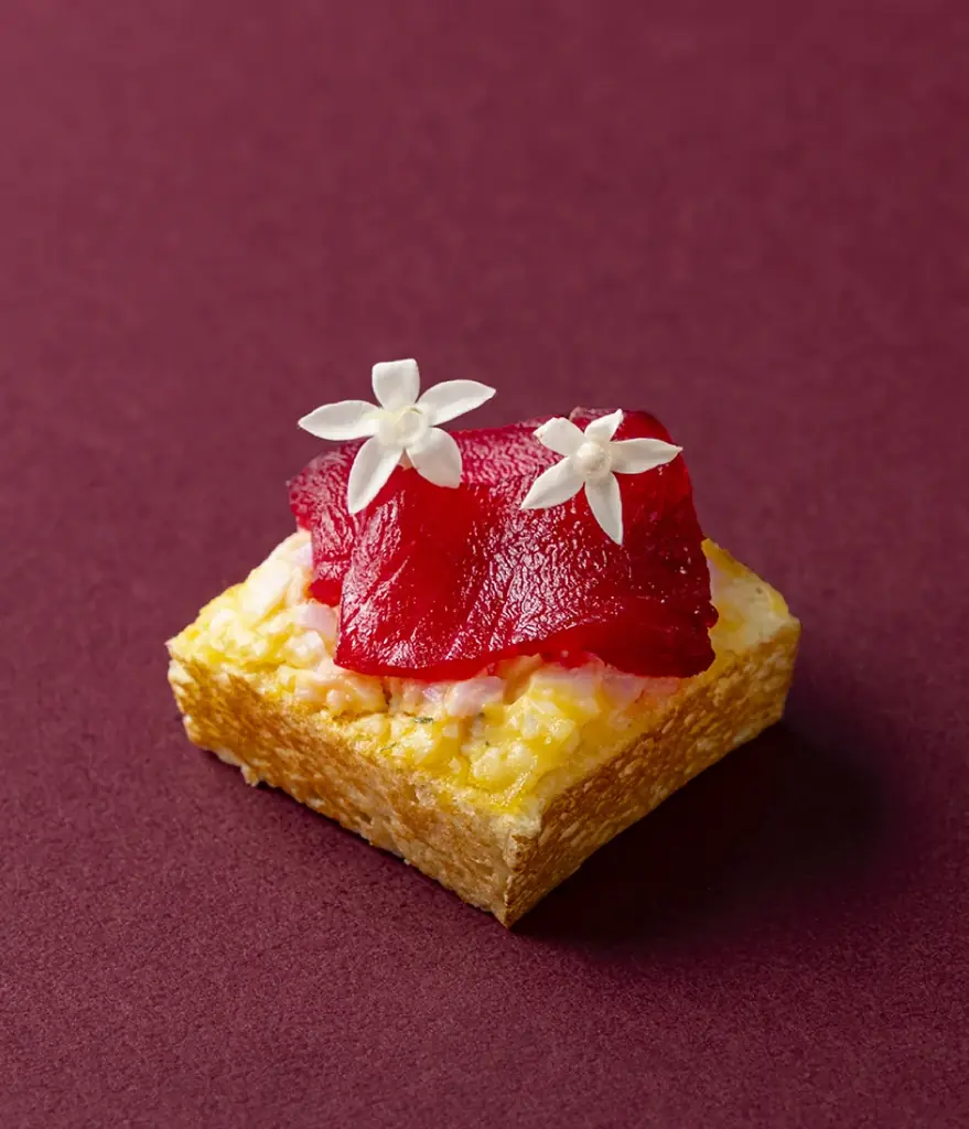ビーツで色付けしたスモークサーモンと、ディルとケッパーを加えた卵サラダをトッピングした一品。深みのある大人の味わいを意図しています。 - 蟹と根セロリのブルーテ キャビア添え